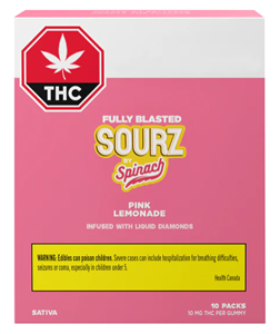 SOURZ by Spinach® Fully Blasted Pink Lemonade gummies have 10mg of THC per piece and the flavours of raspberry and lemonade! These dual-flavoured gummies are over-the-top with natural flavours and blasted with sour crystals. Enjoy 10 gummies with 10mg of THC per gummy and 100mg of THC per pack.